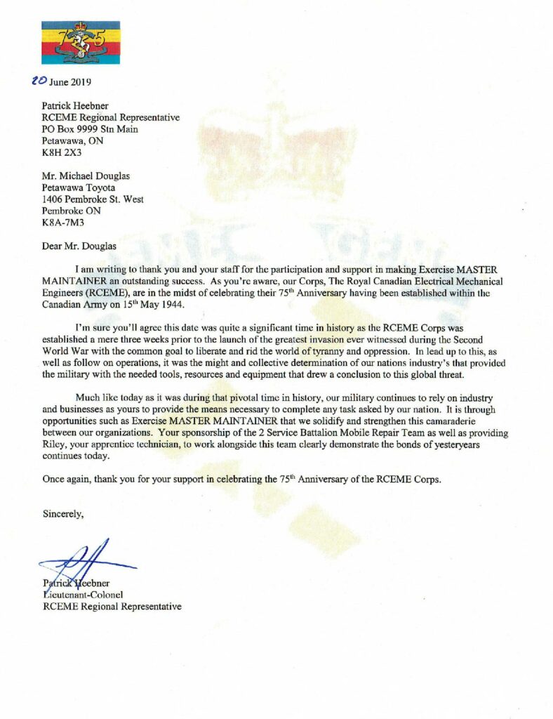 A thank you letter from Lieutenant-Colonel Patrick Heebner, after Petawawa Toyota supported the RCEME Corps 75th anniversary celebration.